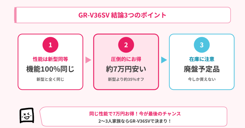 まとめ|GR-V36SVは性能同じで約7万円お得な今買うべき1台
