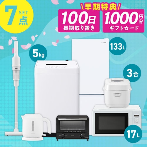 - 7点セット(4種):冷蔵庫、洗濯機、電子レンジ、炊飯器、ケトル、クリーナー、トースターのセット冷蔵庫容量違いで4種。